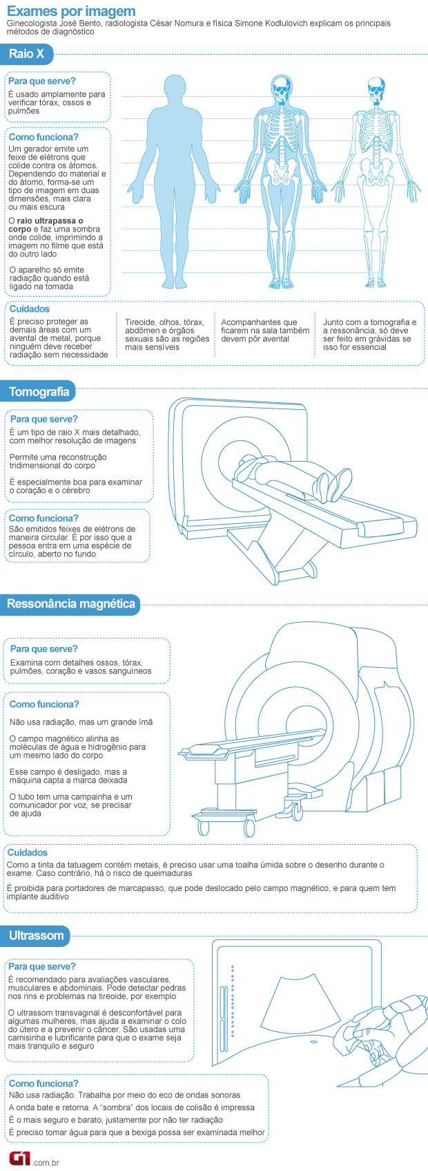 Raio X, ultrassom, tomografia e ressonância magnética são, nessa ordem, os exames por imagem mais usados na medicina. Não existe um número mágico de procedimentos que uma pessoa possa fazer ao longo da vida, e é preciso que todos eles sejam realizados com a indicação e o acompanhamento de um especialista. Segundo o ginecologista José Bento e o radiologista César Nomura, esses quatro tipos de exames integram uma área da medicina que não para de evoluir, com imagens cada vez mais perfeitas e detalhadas.